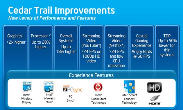 Con ellos, se estima que el rendimiento gráfico será el doble de la generación anterior, nada extraño dado la debilidad de los Atom en ese terreno. Además ofrecen soporte para salidas de vídeo DisplayPort y HDMI, compatibilidad con el sistema inalámbrico para transmisión de contenidos WiDi y otras tecnologías como PC Sync y Fast Boot.