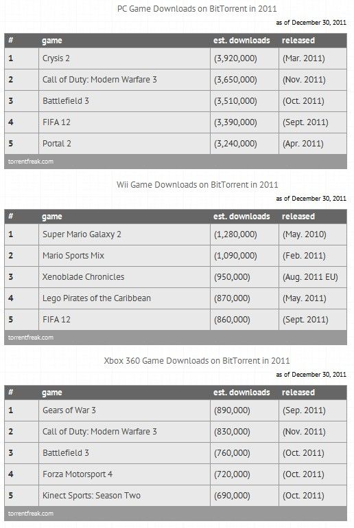 Hablamos de ediciones PC, versiones más pirateadas que las versiones de consola con mucha diferencia. Basta unos datos: Super Mario Galaxy 2 para Wii fue el más pirateado con 1.280.000 y en Xbox 360 fue Gears of War 3 con 890.000 descargas.