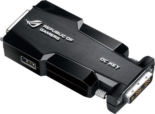 La placa también incorpora un curioso invento llamado OC Key. Gracias a esta llave que se conecta al puerto DVI, el usuario puede ver y modificar parámetros clave en tiempo real, monitorizando multitud de datos y sin necesidad de utilizar software de terceros. Tenéis más información sobre sus posibilidades en la web de ROG.