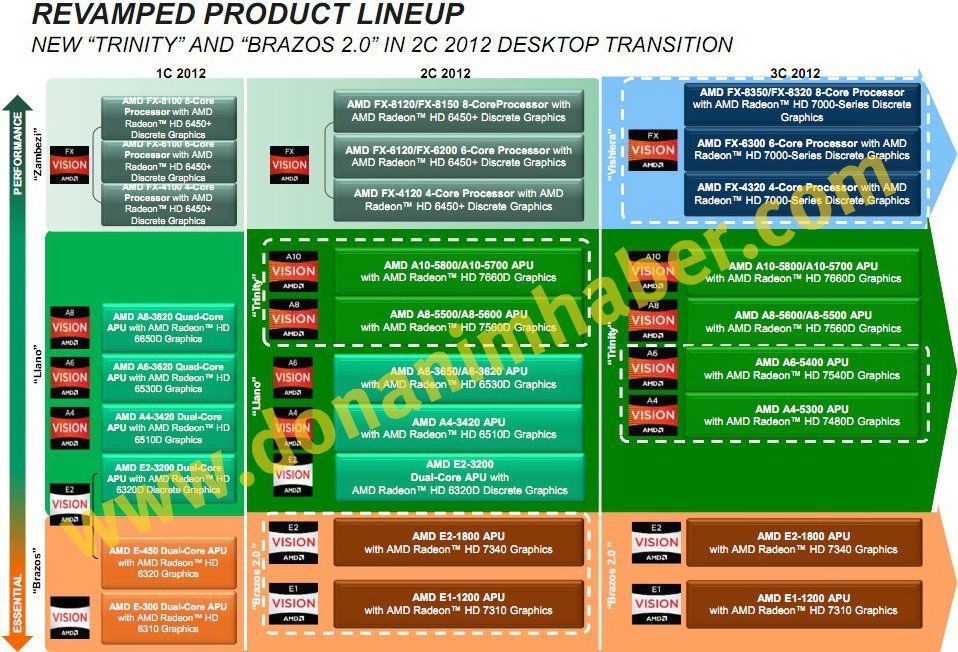 Una hoja de ruta de AMD (lo que se conoce popularmente como roadmap) se ha filtrado en Internet de la mano de la web turca donanimhaber y en ella se muestra tanto la nueva familia de procesadores FX-x300 Vishera como las nuevas APUs A10 para el tercer trimestre de este año.