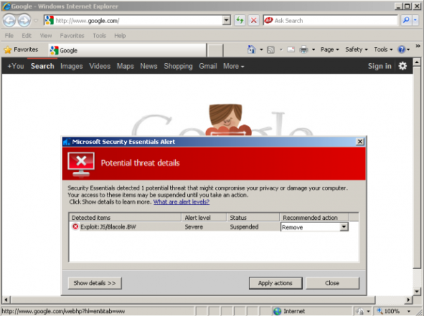 Según parece, ambos programas anunciaban una infección vía Exploit:JS/Blacole.BW, amenaza grave. Sin embargo, nada más lejos de la realidad. Fue un falso positivo, y horas después de la detección del problema Microsoft lo solucionó vía una nueva actualización.