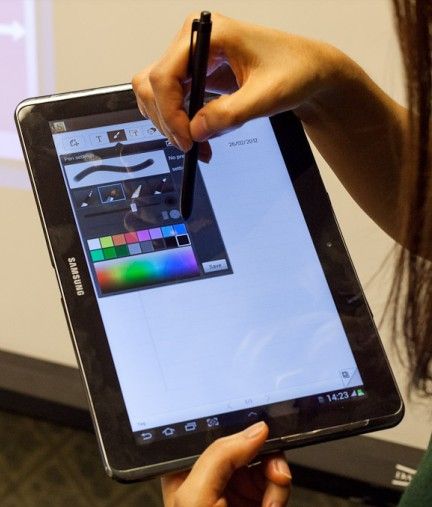El Galaxy Note 10.1 crece de tamaño de forma espectacular, prácticamente duplicando las 5,3 pulgadas de su hermano menor hasta las 10,1 pulgadas. Su resolución es WXGA con 1280 x 800 píxeles y su gran activo es el soporte para lápices táctiles como el S-Pen de Samsung.