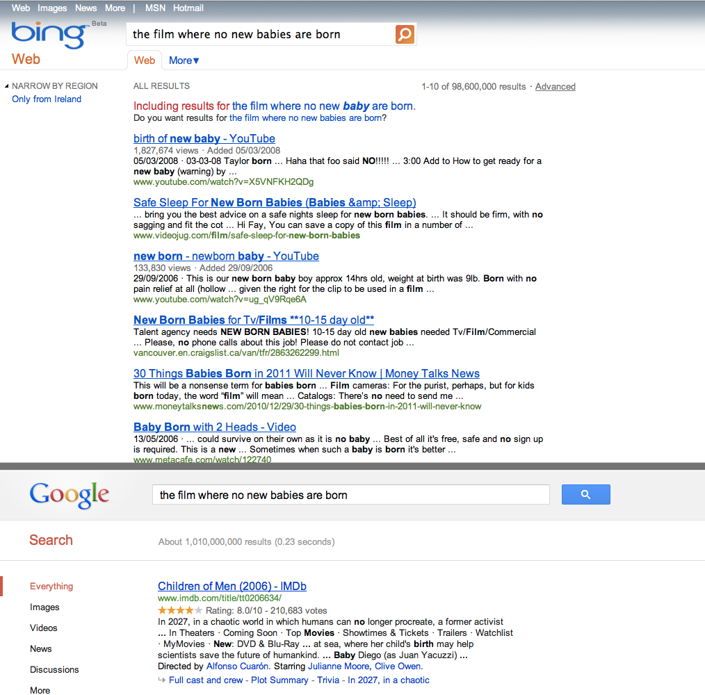 Así pues, cuando un usuario irlandés tecleaba «the film where no new babies are born», que vendría ser «la película en la que no nacen nuevos niños», su meta era el título de la película dirigida por Alfonso Cuarón, Children of Men (Hijos de los hombres). Pero, Bing no le entendía. Mezclaba las palabras sin comprender el significado.