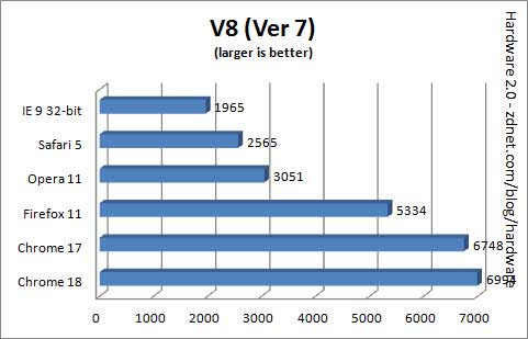 Benchmark V8 (mayor es mejor): Benchmark para JavaScript en esta caso utilizado por Google para tunear su motor V8 lo que puede favorecer al Chrome, como en realidad sucede ya que sigue arrasando en este apartado. Chrome 18 ofrece mejores prestaciones que Chrome 17.