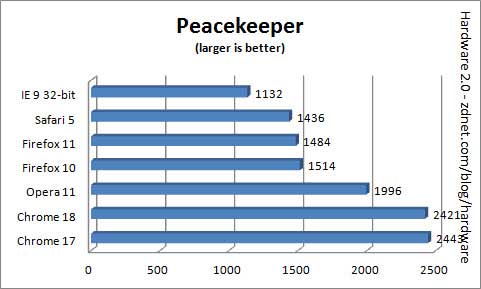Peacekeeper (mayor es mejor): suite de FutureMark que cubre otros apartados de rendimiento además de JavaScript, mediante pruebas de estrés, animaciones, navegación o formularios. Chrome domina en este test, seguramente el más completo y neutral. Chrome 17 es ligeramente más rápido que Chrome 18 en este test.