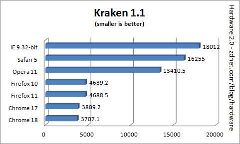 Kraken (en ms, menor es mejor): Otro benchmark JavaScript basado en el SunSpider pero con mejoras. Desarrollado por Mozilla, los resultados pueden favorecer a Firefox aunque el mejor sigue siendo Chrome con la versión 18 mejorando aún más los resultados de Chrome 17.