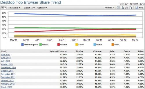 Los datos de NetApplications para el mes de marzo de 2012 han demostrado un ligero cambio de tendencias, con un aumento de cuota de mercado del navegador de Microsoft y un descenso de prácticamente el resto de sus competidores.