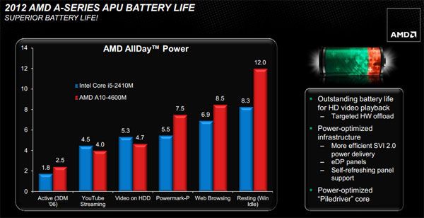 AMD destaca el consumo de estas APU Trinity con modelos de doble núcleo de 17 vatios y variantes de cuádruple núcleo con un consumo tan reducido como 25 vatios. La compañía incluye tecnologías como AMD Start Now que permitirá arranques desde el modo suspensión en portátiles en dos segundos.