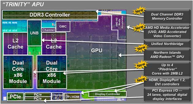 Al igual que los Ivy Bridge de Intel, las APU de AMD incluyen en la die la CPU, GPU y la controladora de memoria. La CPU usa un socket FM2 e incluye dos o cuatro núcleos de procesamiento Piledriver con frecuencias de hasta 3,2 GHz. La controladora de memoria soporta DDR3 hasta 1600 MHz y las gráficas son integradas de última generación Radeon 7xxx.