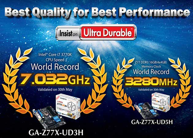 Muestra de la capacidad de overclocking de sus placas base y utilizando refrigeración con nitrógeno líquido, la compañía utilizó la GIGABYTE Z77X-UD3H para aumentar la frecuencia del microprocesador más potente de los Ivy Bridge, el Core i7 3770K, hasta 7,032 GHz.