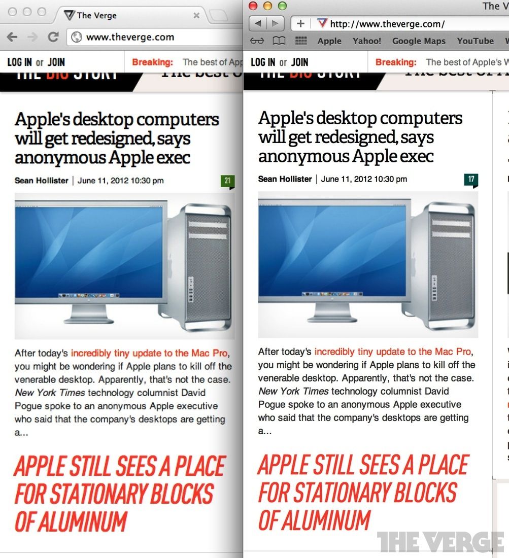 Lo demuestran en The Verge al comparar el rendimiento y sobre todo la visualización de páginas web en ambos navegadores en un MacBook Pro con Retina Display. Al comprobar con detalle cómo se renderizaban textos e imágenes se vio que el navegador de Google no soportaba correctamente la gran resolución aportada por esos equipos.