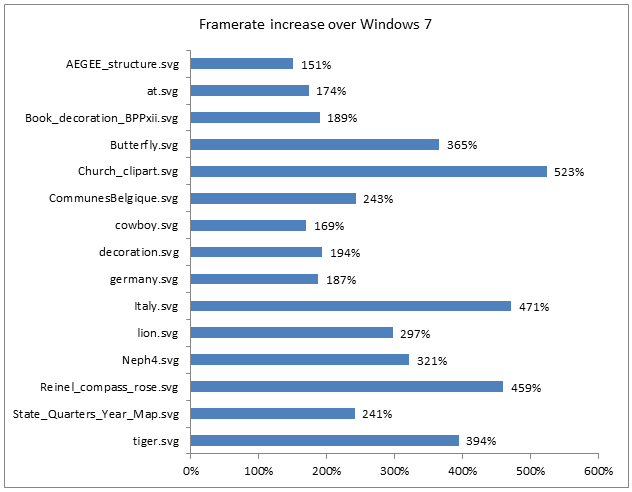 De esta forma, DirectX se convertirá en una «plataforma gráfica con aceleración por hardware para todo tipo de aplicaciones», especialmente las de ‘estilo Metro’. Según Microsoft, las mejoras sobre Windows 7 serán evidentes como muestran las siguientes tablas: