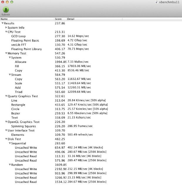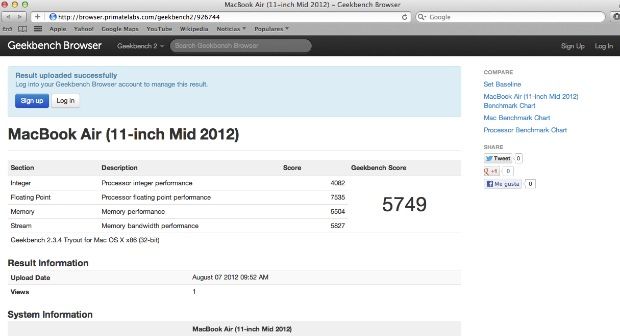Respecto a las pruebas de velocidad de sus componentes internos (procesador, memoria, gráficos y almacenamiento), se nota mucho la plataforma Ivy Bridge de Intel y la memoria DDR3L a 1.600 MHz. Además, los gráficos Intel HD GMA 4000 ofrecen hasta un 60% más de rendimiento que el subsistema gráfico del modelo anterior (HD GMA 3000), sin olvidar que las nuevas SSD usadas en los MacBook Air son más veloces. A continuación os dejamos con los resultados obtenidos en la batería de tests que hemos usado: Geekbench 32 bits, Xbench y Disk Speed Test.