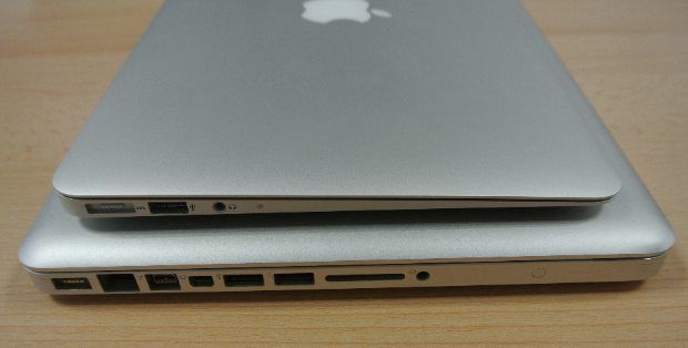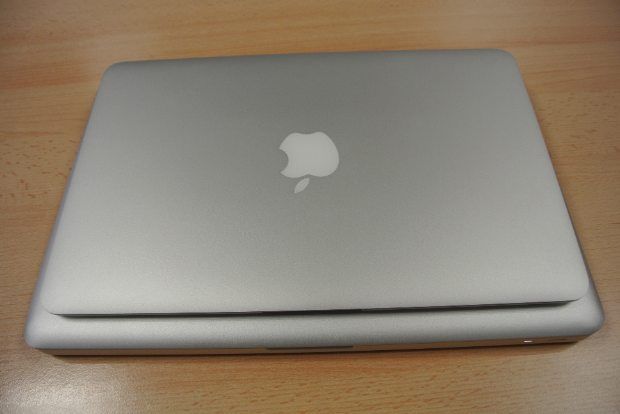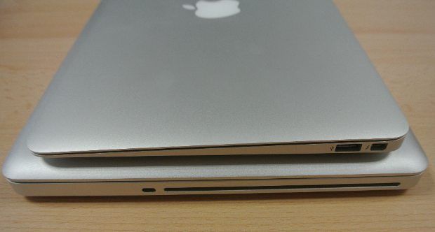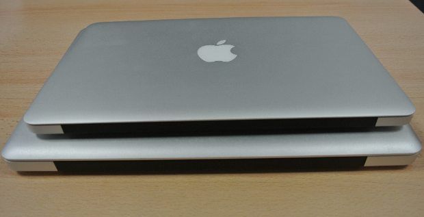 Para que os hagáis una idea del tamaño del MBA 11″, os mostramos cinco imágenes en las que se compara con un MacBook Pro de 13 pulgadas en todas las posiciones posibles (bueno, faltaría comparar su parte de abajo, que como ya hemos mencionado está totalmente atornillada).