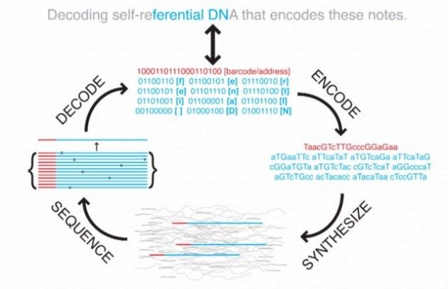 La investigación de Harvard -como otras de almacenamiento biológico- piensa en el ADN como en cualquier otro dispositivo de almacenamiento digital aunque en lugar de datos binarios que se codifican en un disco duro, aquí se sintetizan hebras de ADN donde cada una de las bases (TGAC) representan un valor binario (T y G = 1, A y C = 0).