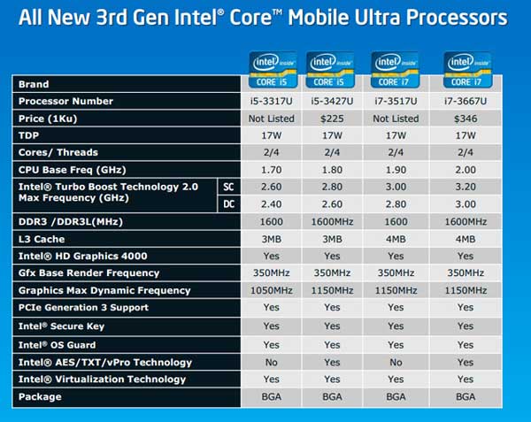 Como adelantan en Ultrabook profesionales, la serie contempla cuatro modelos Core i5 y Core i7, con dos núcleos físicos y cuatro hilos de procesamiento nativo, caché de tercer nivel de 3 y 4 Mbytes y frecuencias de trabajo de hasta 3 GHz mediante Turbo Boost. Estos microprocesadores incluyen en la die tanto la controladora de memoria como la gráfica integrada HD 4000.