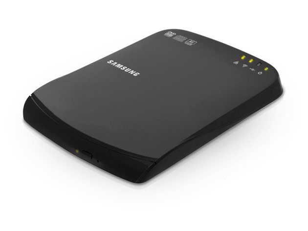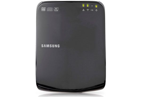 Samsung ha apostado por un diseño funcional, de estética elegante y sin estridencias. En la parte posterior veremos un panel de conexiones que ya adelantan las posibilidades de este pequeño dispositivo: puerto mini USB, USB 2.0, toma Ethernet y puerto de alimentación. Cuatro pequeñas luces situadas en el frontal informan en todo momento de su estado y un botón físico sirve para liberar la bandeja de la unidad óptica.