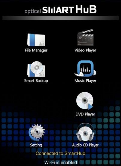La instalación del Samsung Optical Smart Hub es muy sencilla en entorno Windows, gracias al disco incluido. El software crea automáticamente una red ad hoc para el dispositivo y lo registra, sin pedir al usuario ningún dato y en menos de 5 minutos. Lamentablemente, es bastante más complicado funcionar con Mac OS X, a pesar de que la marca indique plena compatibilidad. Una vez concluido el proceso, el Samsung Optical Smart Hub aparecerá en los dispositivos como una unidad física más.