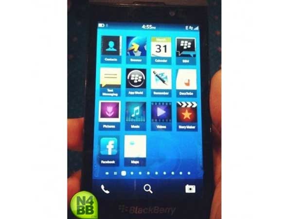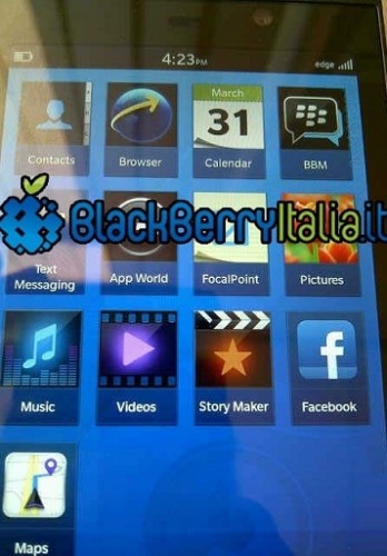 Aplicaciones de la pantalla de inicio en las que se incluirían herramientas para música, videos, mapas, App World, mensajes de texto, BBM, calendario, navegador, contactos, Facebook y DocsToGo.