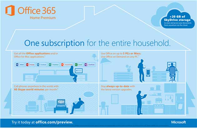 – Office 365 Home Premium. Diseñado para el sector de consumo, ofrece cinco licencias de usuario intercambiables entre la familia y equipos Windows o Mac. Incluye las aplicaciones Word, Excel, PowerPoint, OneNote, Outlook, Access y Publisher. También incluye 20 Gbytes de almacenamiento adicional en SkyDrive y 60 minutos internacionales al mes en Skype. Contará con actualizaciones gratuitas de software y costará 99,99 dólares anuales.
