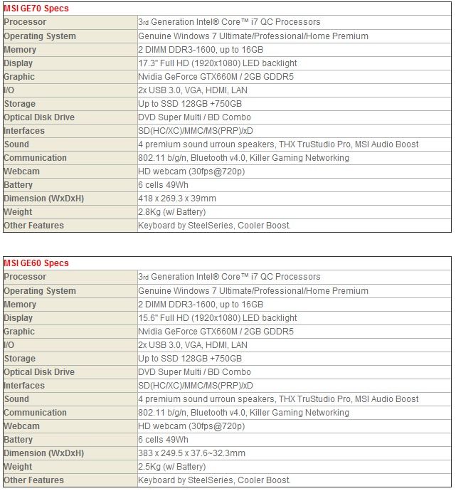 Los MSI GE60 y GE 70 mantienen las pantallas de 15,6 pulgadas y 17,3 pulgadas respectivamente con resoluciones de alta definición Full HD. También potentes procesadores Core i7 serie Ivy Bridge, en medio de unas especificaciones de gran nivel que puedes revisar en la siguiente imagen: