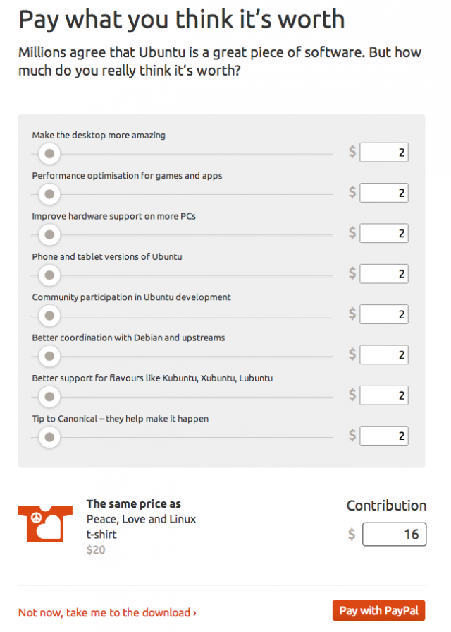 «Paga por lo que tú crees que merece la pena pagar de Ubuntu», dicen desde Canonical en el nuevo sistema de donaciones, bien visible a través de un formulario en su portal web mostrado antes de la descarga de la distribución.