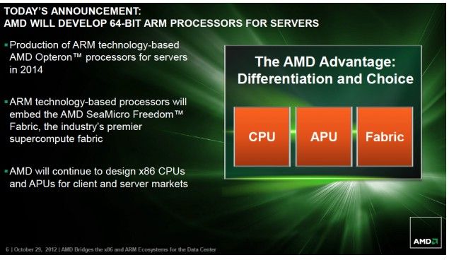 Esta colaboración estratégica con ARM representa la siguiente fase de la estrategia de AMD para proporcionar soluciones para los mega centros de datos emergentes. En marzo, AMD anunció la adquisición de SeaMicro, el líder en servidores de alta densidad y eficiencia energética. Con el anuncio de hoy, AMD integrará la estructura AMD SeaMicro Freedom con sus procesadores basados en AMD Opteron x86 y ARM, lo que permitirá miles de clusters de procesador que se unirán para proporcionar las soluciones con mayor eficiencia energética.