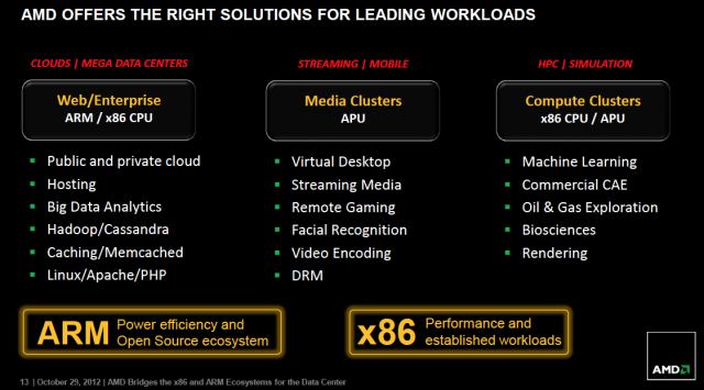 La explosión del centro de datos ha traído una oportunidad para optimizar la informática con numerosas soluciones. AMD ofrece un ecosistema informático lleno de opciones, ofreciendo soluciones basadas en procesadores x86 AMD Opteron, nuevas APUs para servidores que permiten una Arquitectura de Sistemas Heterogénea (HSA), y nuevas soluciones basadas en tecnología ARM de 64 bits.