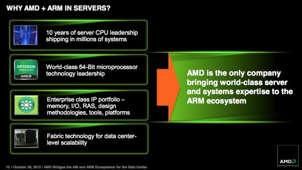 Si ARM se convirtiera en una fuerza significativa en este mercado, la capacidad de ejecutar de forma nativa cargas de trabajo ARM y x86 en un solo chip, podría llegar a ser muy atractivo para AMD en su batalla contra Intel. La compañía podría incluso descartar el núcleo x86 en un futuro vinculando las CPUs ARM con su propias GPU de alto rendimiento. Un cambio significativo para AMD y para el mercado computacional.