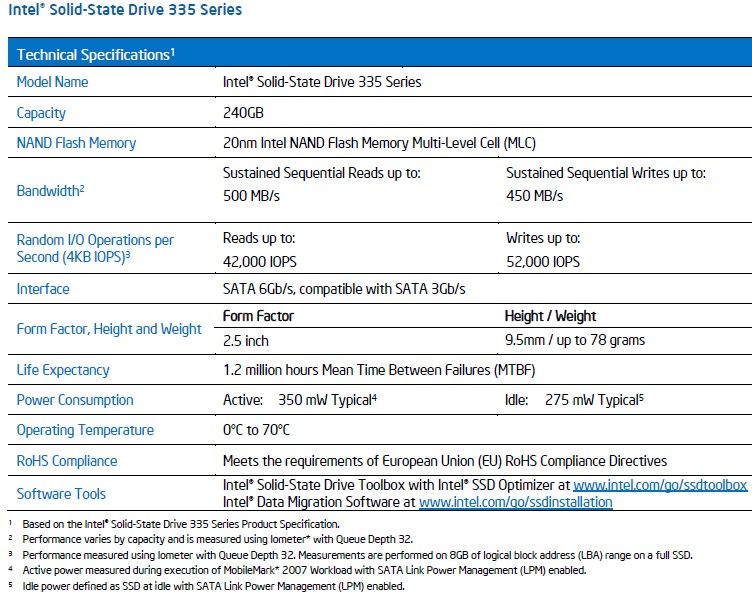 Las Intel SSD 335 usan interfaz SATA 6 Gbps y un controlador SandForce SF-2281 para alcanzar velocidades en transferencia de datos sostenidos de 500 y 450 Mbytes por segundo en modos lectura/escritura y hasta 50.000 IOPS.