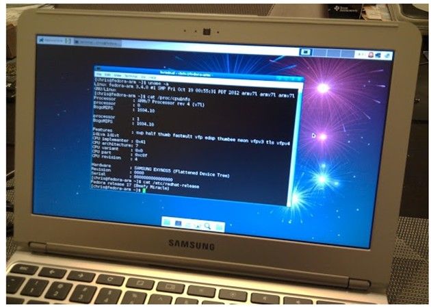 El desarrollo instala Fedora 17 con el entorno de escritorio Xfce en una tarjeta SD permitiendo conservar el Chrome OS y un interesante arranque dual. Dicen que la ejecución no es perfecta pero debe ir puliéndose en el futuro lo que añade aún más atractivo a este ordenador portátil para la nube de Samsung y Google.