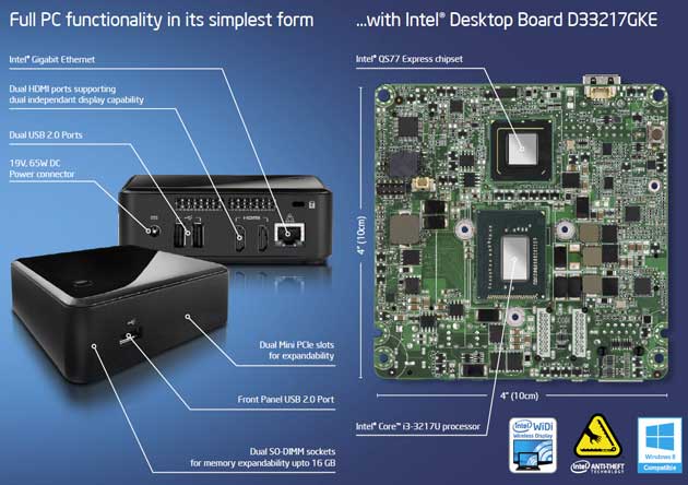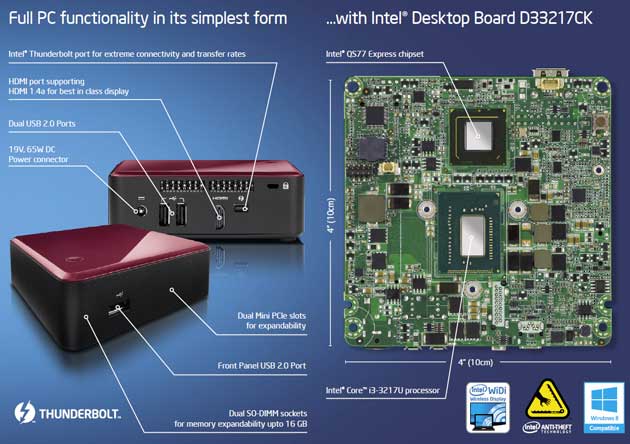 A cambio ya sabes, un chasis cuadrado con factor de forma de 11,6 centímetros, según Intel lo más reducido posible para los módulos de expansión y la lógica necesaria para soportar los procesadores de última generación Ivy Bridge que incluye con un Core i3-3217U como procesador elegido.