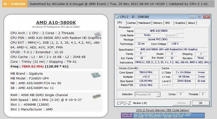 Durante el AMD Extreme OC que se celebró en Taiwán hace unos días, expertos en overclocking han alcanzado los 8,47 GHz con un montaje basado en la GIGABYTE F2A85X-UP4 y utilizando un procesador AMD A10 5800k. Durante la misma competición se alcanzaron los 7,86 GHz utilizando los mismos componentes.