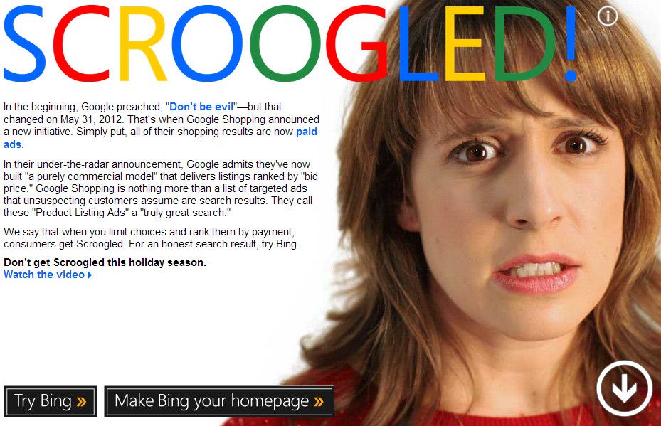 Microsoft se ha inventado la denominación Scroogled! para acusar a Google de engañar a los consumidores en el buscador-recomendador de compras Google Shopping, ya que -a su juicio- todos los artículos mostrados son patrocinados y su puesto en la lista se basa en la cantidad de dinero pagado por el fabricante y no por la calidad del producto.