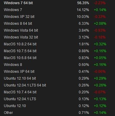 Otro de los datos destacados es la gran presencia de usuarios de Windows 8, con una cuota que supera el 7 por ciento, lo que quintuplica la que obtiene el último sistema operativo cliente de Microsoft en el escritorio, a pesar de las críticas, incluidas las del fundador de Valve.