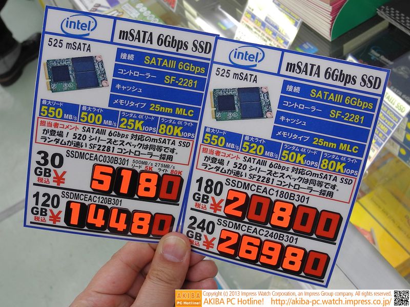 Las Intel SSD 525 ya se comercializan en Japón en modelos con 30, 120, 180 y 240 Gbytes de capacidad de almacenamiento por 42, 118, 169 y 219 euros respectivamente. Se espera disponibilidad internacional inmediata.