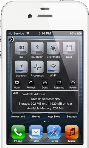 - SBSettings – SBSettings is el tweak más útil con diferencia en Cydia. Desde él se puede acceder a la activación y desactivación de datos, GPS, Wi-Fi e incluso el brillo de la pantalla, o bien reiniciar el dispositivo, bloquearlo, etc arrastrando la barra de estado hacia abajo.
