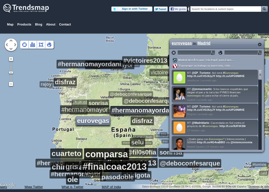 Así, a quienes gustó Tweetping, seguramente gustará también Trendsmap, como el propio sitio indica, «una cartografía en tiempo real de las tendencias de Twitter en todo el mundo». En resumen: ¿quieres saber lo que se cuece en una zona concreta del mundo? Tan sencillo como desplazarse cual Google Maps y pulsar sobre cualquier hashtag para ver los últimos tuits al respecto.