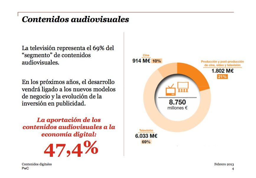 José Antonio Ortega, director de Media de pwc, presentó la parte más técnica del estudio que resumimos en las siguientes gráficas. Los contenidos audiovisuales generan mayor parte de la tarta. Aquí se incluye la televisión, publicidad, cuotas de TV de pago, cine… Supone el 47,4 %.