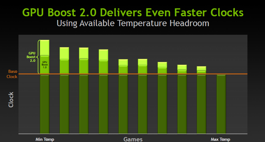 Además de ello integra la nueva tecnología GPU Boost 2.0, que permite seguir de manera más precisa la evolución de temperatura para hacer un overclock inteligente de la tarjeta aún más allá que en las gráficas Kepler.