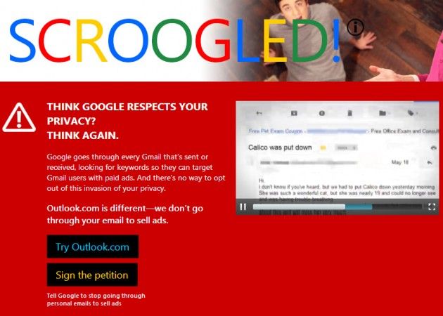 La campaña, (mientras Google permanecía en silencio) ha ido subiendo de tono al incluir entre los productos criticados al cliente de correo electrónico bajo Don’t Get Scroogled by Gmail y mientras Microsoft recomendaba utilizar Outlook.com ante “la invasión a la privacidad de Gmail”.