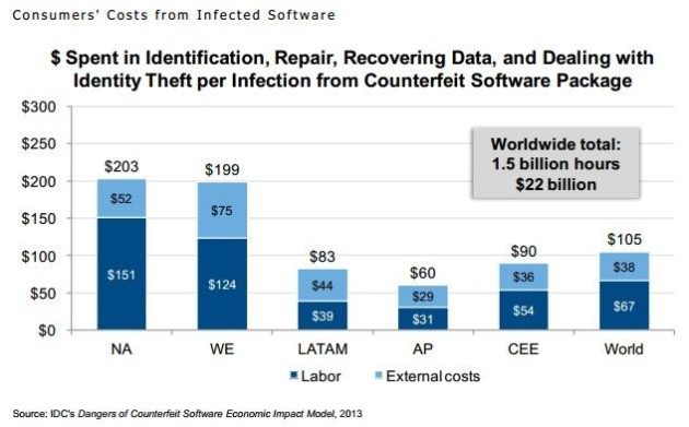 Según el estudio los costes directos que atañen a las empresas y la lucha contra la piratería ascience a 114.000 millones de dólares este año o bien que los consumidores gastarán 1.500 millones de horas lidiando con esos problemas. Según parece, gran parte del software pirateado llega de manera preinstalada cuando un usuario compra su ordenador.