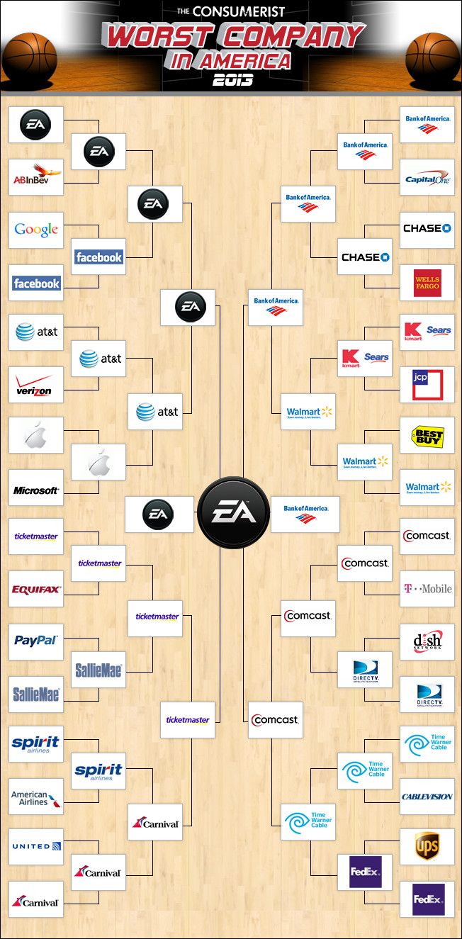 Es el segundo año consecutivo que la gente de EA recibe este «honor», superando ampliamente a otras como Bank of America, Comcast, y Ticketmaster, que se hicieron con el segundo, tercer y cuarto puesto, respectivamente. EA obtuvo el 78% de los votos en la ronda final, mientras que Bank of America se quedó con el 22% restante.