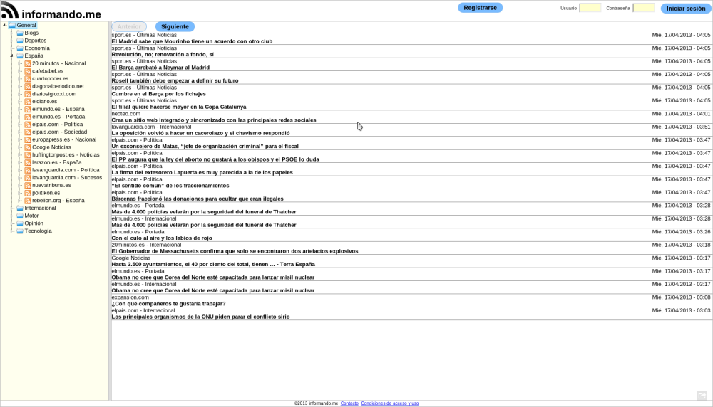 El primero es Informando.me, una suerte de clon de Google Reader bastante interesante a priori, a pesar de que no le vendría mal un lavado de cara, una actualización estética en condiciones. Por lo demás, el funcionamiento no le será desconocido a ningún usuario de Google Reader: permite importar las fuentes desde éste, fijar una localización que no sabemos si influye o no en las fuentes que vienen por defecto -y son muchas-, compartir vía Twitter y poco más.