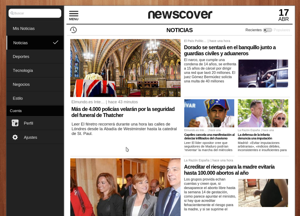 El segundo en procesión es NewsCover, que no es propiamente un lector de noticias al uso, sino más bien un «descubridor inteligente de noticias populares», aunque no es tan sencillo. Por defecto, NewsCover muestra una interminable lista de noticias, ordenadas por fecha y popularidad. Y cuando decimos lista, queremos decir una interfaz atractiva a lo Flipboard, totalmente visual. Y cuando decimos popularidad, ¿popularidad en base a qué?