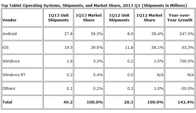 Según la consultora IDC se acaba un ciclo, ya que por primera vez desde que el iPad original relanzó el mercado de la tableta electrónica, Android ha superado en el primer trimestre de 2013 la cuota de mercado de iOS: