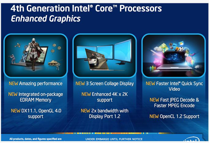 Aunque no podrán competir en rendimiento de manera alguna con una gráfica dedicada de AMD o NVIDIA, los nuevos chips gráficos de Intel para la próxima plataforma de procesamiento Haswell, prometen una importante subida de potencia, mejora de características y aumento de soporte para librerías multimedia.