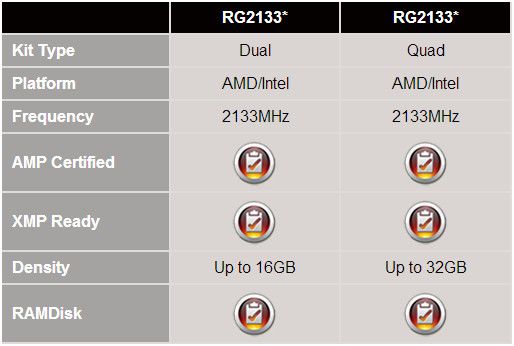Aprovechando la marca Radeon y comercializadas originalmente bajo las series Entertainment, Perfomance y Radeon, diferenciadas por su velocidad máxima certificada y el voltaje al que funcionan de serie, AMD aumenta catálogo con las AMD Radeon RG2133 , un kit de cuatro módulos para un total de 16 Gbytes. (4 x 4 GB)