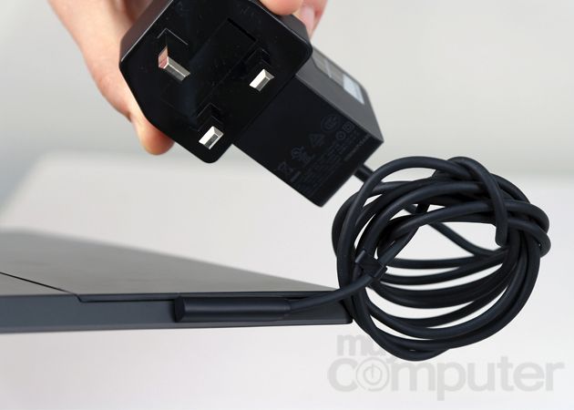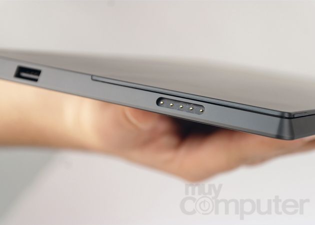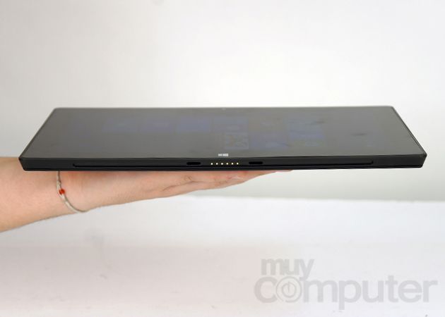 En los lados del dispositivo podemos pasar revista a los conectores. En la parte inferior encontramos uno magnético de seis contactos que nos permitirá conectar y alimentar dispositivos (por ahora solamente las Type y Touch covers, las fundas con teclado de Microsoft). En la parte inferior derecha encontramos otro conector magnético, esta vez de cinco pines, que conecta al alimentador. Microsoft ha optado por un conector tipo magnético descartando la solución MicroUSB estándar.