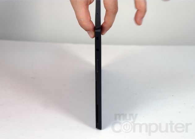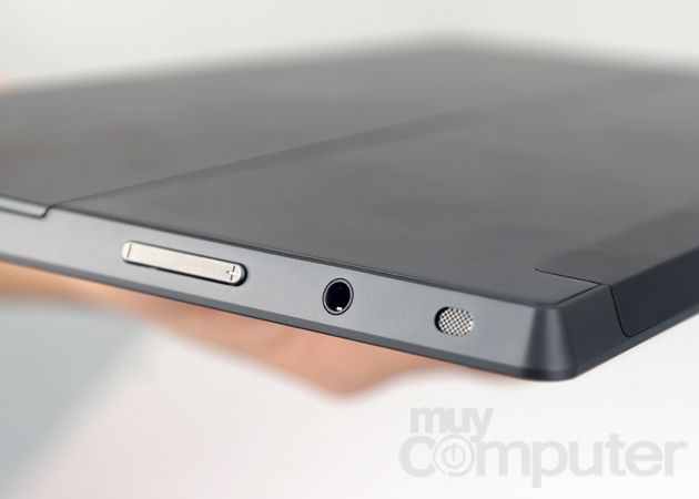 Junto al conector USB encontramos una conexión HDMI, en este caso de tipo micro, para conectar con monitores y televisores. Luego encontraremos el proverbial botón de encendido. En la parte izquierda se coloca la conexión para auriculares y el control de volumen. La ranura para tarjetas MicroSD solamente es accesible al levantar la tapa/soporte de la parte posterior.